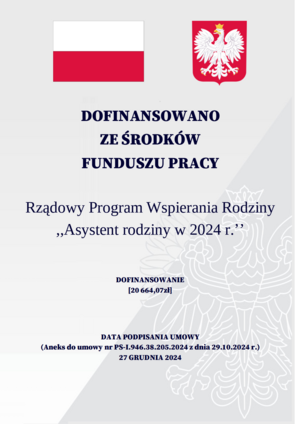 Nazwa zadania: Dofinansowanie zadania własnego beneficjenta Programu związanego z dofinansowaniem kosztów zatrudnienia asystenta rodziny poniesionych przez beneficjenta począwszy od 1 stycznia 2024 roku do 31 grudnia 2024 roku.